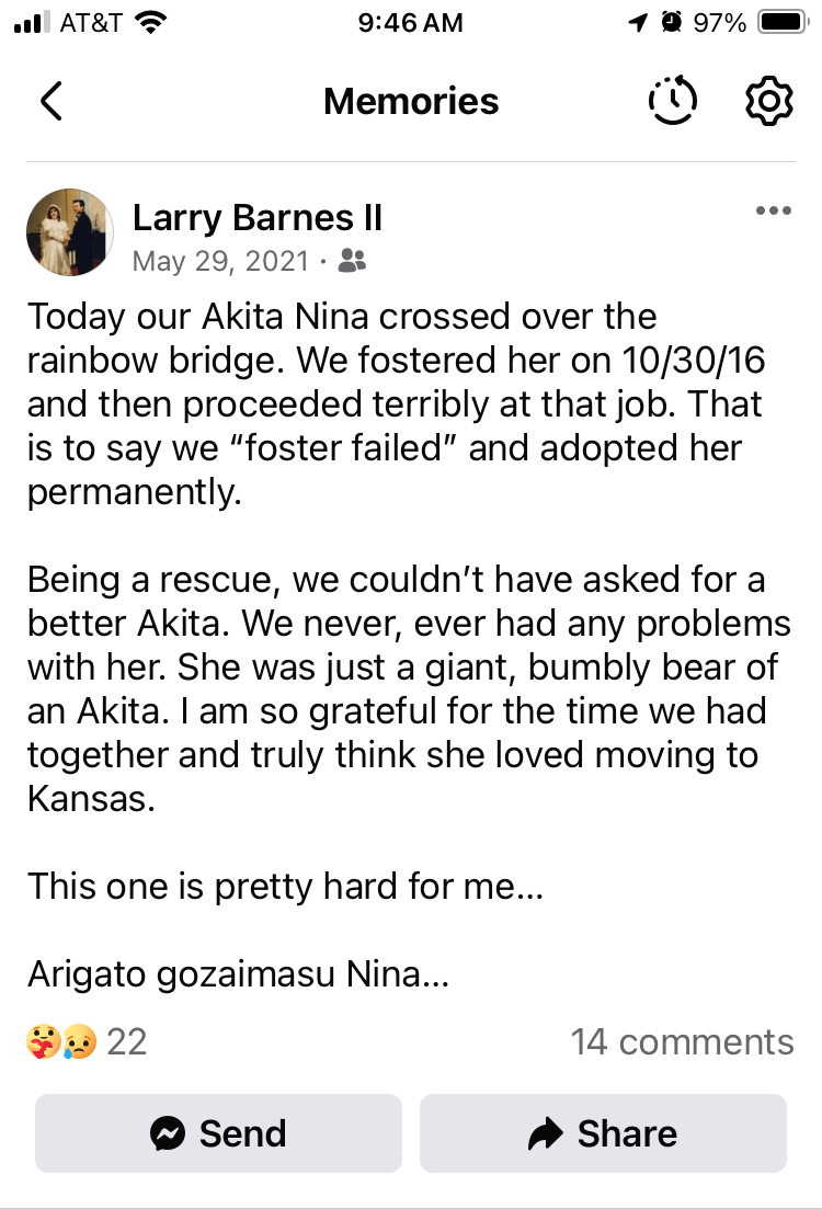 Life Event #2: On this day in 2021, we said goodbye to our third Akita, Nina who we rescued. If you don't understand someone's love for pets, move along.