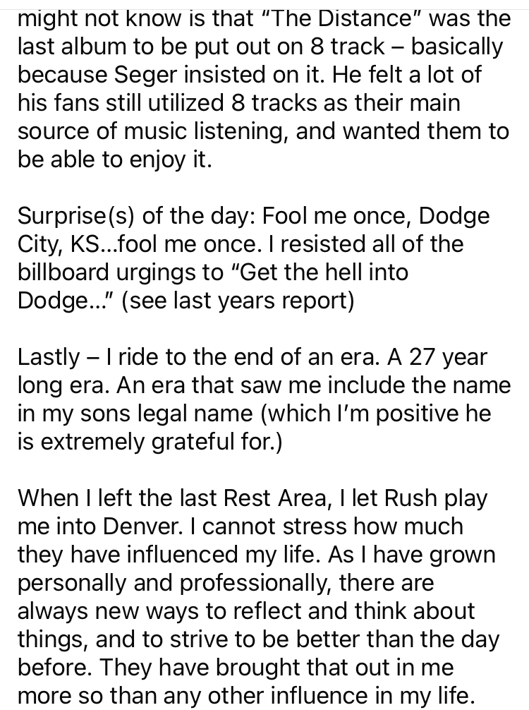 Prior to the R40 tour announcement, for 2015 I had already planned a lengthy three week motorcycle trip that I then had to rearrange so that I could see them in Denver that very last time. This was my "Dances With Wolves" trip that saw me ride Ohio, Indiana, Illinois, Missouri, Kansas, Colorado, Nebraska, South Dakota, Wyoming, Montana and Iowa. Just an all around epic trip that was partially solo, partially with Shannon. But that's a story for another day. Below I'm including part of that ride report - the day I rode into Denver knowing that the next day would be the last time I would ever see them live.
